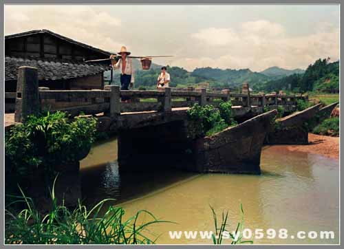 楚三公祠位于忠山村西南部,楚三公祠是忠山楊氏第十三世楊楚三所建于清同治年間(1862-1874年)。占地面積700余平方米,建筑面積約500平方米,為兩進(jìn)制穿斗式硬山頂木構(gòu)建筑。楚三公祠由前大坪、副厝、門樓、前廂、前堂、天井、書屋、花廳、上堂、后堂風(fēng)火圍墻組成。前大坪為磚鋪地面,前堂外設(shè)有大門,石礎(chǔ)、石框、石楣,重檐歇山式,前堂穿斗與梁枋間雕刻精美,門窗均有木透雕,人物、鳥獸、花卉圖案,工藝精湛,栩栩如生。現(xiàn)為三明市第三批文物保護(hù)單位。 隆武橋
