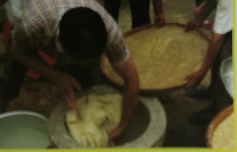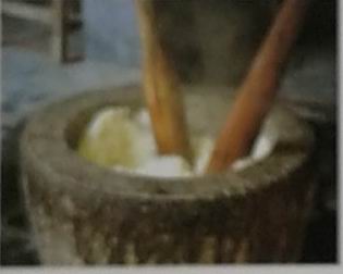(2)舂糍:將蒸熟后的糯米倒入石臼去舂,先用溜錘粗加工,使松散的糯米粘在一起后,再用臼錘成糍。
