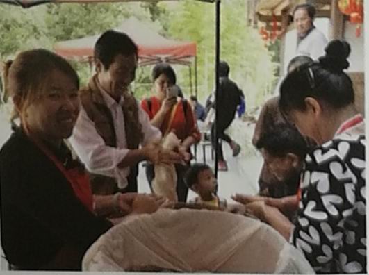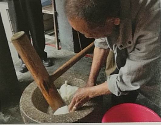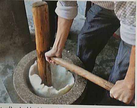 (3)將蒸好的粳米倒石臼用臼錘挫綿。
