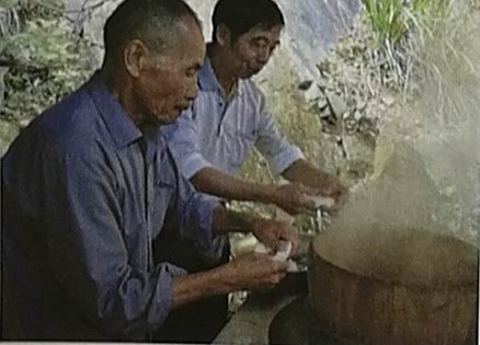 (4)把挫成碗狀的“粿生”用手掰成碎塊放入飯甑中再次蒸熟。