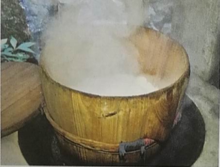 (2)蒸米:把燙好的粳米放在飯甑中蒸熟。