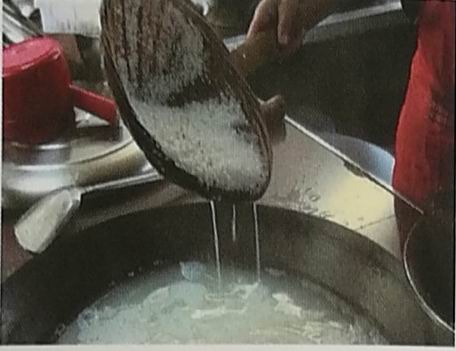 (1)燙米:就是將浸泡的粳米,倒入簸箕中濾去水份,等大鍋水燒開后把米倒入鍋中再用鍋鏟來回翻動,使粳米有一定的粘度。
