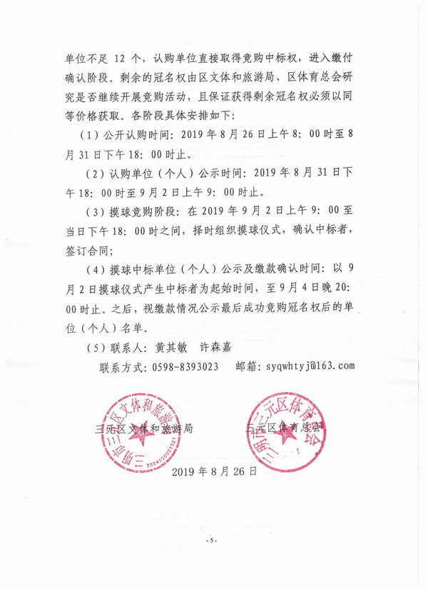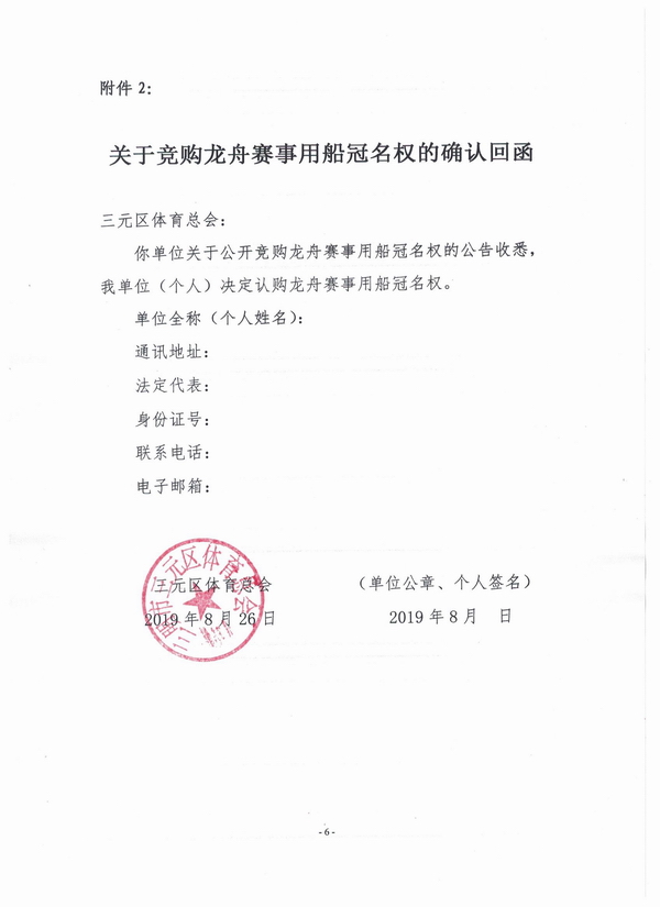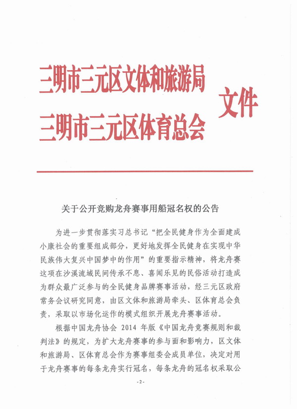 龍舟賽在三明歷史悠久,是沙溪流域百姓傳承不息的民俗體育活動(dòng),這項(xiàng)全民健身運(yùn)動(dòng)充分展現(xiàn)了同舟共濟(jì)、團(tuán)結(jié)拼搏、奮勇爭先的民族精神。將龍舟賽打造成為沙溪兩岸群眾最廣泛參與的全民健身品牌賽事活動(dòng),是民意所在、民心所向!為切實(shí)把這場由政府搭臺(tái)、專業(yè)協(xié)會(huì)組織、社會(huì)各界和廣大群眾廣泛參與的大型活動(dòng)舉辦好,區(qū)文體和旅游局、區(qū)體育總會(huì)定于8月26日至9月4日組織開展龍舟賽事用船冠名權(quán)競購活動(dòng),具體事項(xiàng)詳見《關(guān)于公開競購龍舟賽事用船冠名權(quán)的公告》,也可撥打0598-8393023電話咨詢或直接至三明市三元區(qū)新市南路142號(hào)綠都大廈九樓902室面詢。竭誠歡迎社會(huì)各界和廣大龍舟愛好者積極參與此次公開競購龍舟賽事用船冠名權(quán)活動(dòng)。 附件: 1.《關(guān)于公開競購龍舟賽事用船冠名權(quán)的公告》 2.《關(guān)于競購龍舟賽事用船冠名權(quán)的確認(rèn)回函》