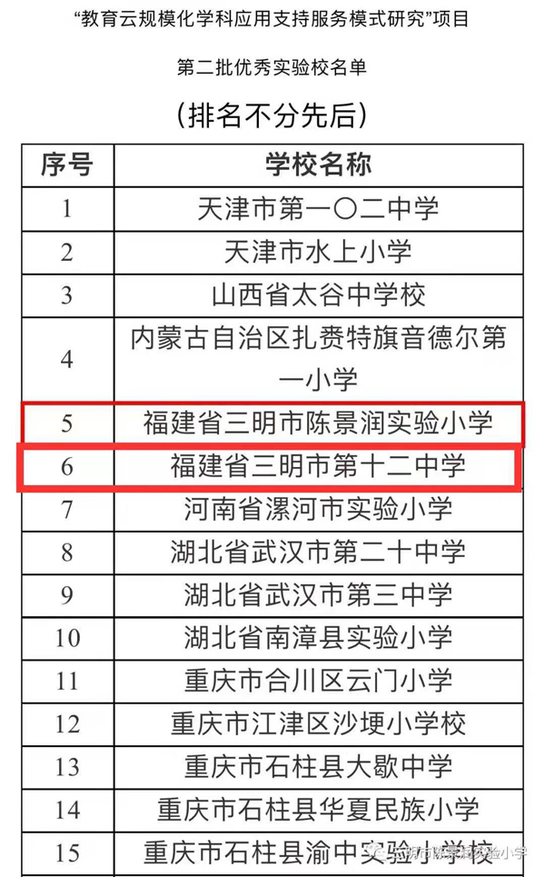 近日,中央電化教育館公布全國“教育云規模化學科應用支持服務模式研究”項目第二批優秀名單,全國共50所,我區三明市陳景潤實驗小學、三明十二中兩校獲優秀實驗學校榮譽稱號。