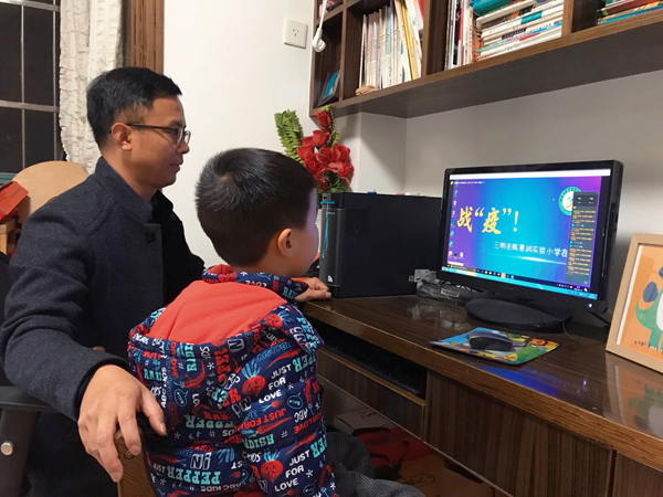 2月13日,三明市陳景潤實驗小學二年級6班的李子謙在爸爸的陪伴下在電腦前認真地聽著課。屏幕另外一端,是他的語文老師鄧麗娟。 上午8:30,語文老師們進入釘釘群,開始網(wǎng)絡“云教學”。主要對已學知識進行鞏固,還針對疫情防治開創(chuàng)特色教育專題課,在推進網(wǎng)絡微課的同時,每日進行線上輔導。今天鄧麗娟留給同學們的作業(yè)是將防疫小課堂后的感受制作成繪本。