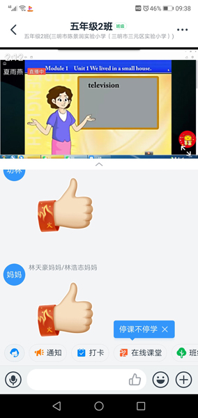 除了每日語、數(shù)、英課程,學校還開展了體育運動、防疫知識、美育、德育等特色直播課程。每日下午為教師為學生在線答疑解惑時間,所在班級任課老師進入釘釘班級群在線檢查解答學生的問題,打破了地域的界限,將師生聯(lián)系在一起。同時,學校倡議家長共同教育并監(jiān)督孩子認真上好線上學習指導課程、完成線上作業(yè)并及時提交教師批改。
