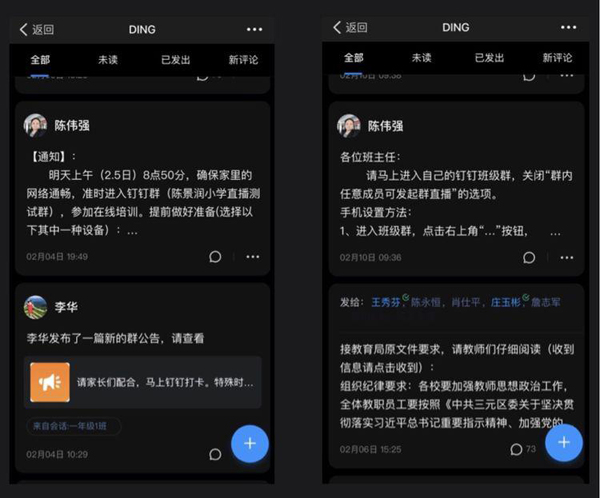 搭建交流平臺,做好防控保障。為保證教師們能夠熟練運用系統,通過釘釘視頻在線直播輔導,授課模式、互動方式、實際操作等功能,積極交流探討可能遇到的各項問題,及時找到正確的解決方法。通過電話、微信、釘釘群等方式與學生及其家長進行互動,對學生的學習和生活進行指導,寒假作業答疑輔導。同時啟動“師生線上報平安”,使用釘釘進行地毯式滾動摸排,重點對外籍和赴外探親的師生開展精準定向追蹤,每天進行健康報告和打卡活動,筑牢阻擊疫情銅墻鐵壁。