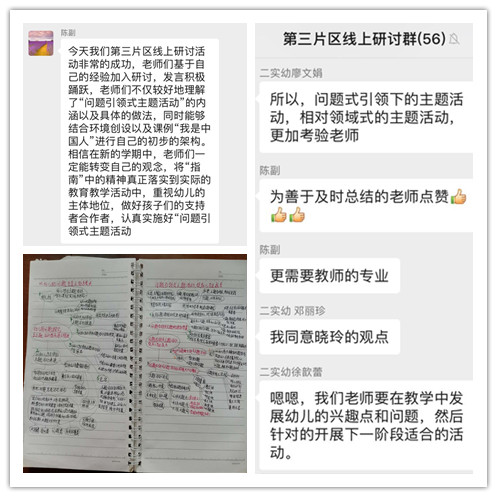 3月31日上午9點,線上研討正式開始,進修學校教師進行線上指導。研討結束后,對此次研討活動做出了總結、提升,提煉出了知識點,讓老師們更加明確對“問題引領式主題活動”認識以及實施與開展的具體措施等。 停課不停研,且思且成長。此次的線上教研活動,為第三片區的教師們提供一次深入了解學習問題探究式主題活動的實施和開展的機會。 |