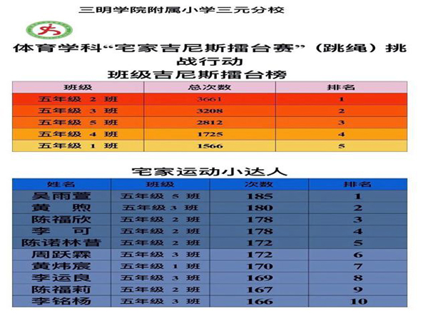為豐富學(xué)生居家抗“疫”生活,緩解疫情給學(xué)生帶來的身心和學(xué)業(yè)壓力,減少電子設(shè)備對視力的影響。近日,三明學(xué)院附屬小學(xué)三元分校舉辦首屆“線上跳繩吉尼斯擂臺賽”。