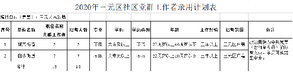 為建設一支高素質的社區工作人才隊伍,選考優秀人才到社區基層工作,提升城市基層黨建、社區治理和服務能力,根據《中華人民共和國城市居民委員會組織法》、《中共福建省委組織部關于加強黨群工作者隊伍建設進一步充實基層治理力量的通知》(閩委組通〔2020〕17號)、中共三明市委、三明市人民政府印發《關于加強和完善城鄉社區治理的實施意見》(明委發〔2018〕15號)等文件精神,按照“公開招聘、定崗競爭、擇優入圍、依法選舉”的原則,決定面向社會公開招聘社區黨群工作者。具體方案如下: 一、指導思想 按照社區黨群工作者職業化、專業化、規范化的標準,堅持“公開、公正、公平,擇優錄取”的原則,面向社會公開招聘社區黨群工作者,加強社區黨建黨務工作力量,推動社區治理更好更快地發展。 二、組織領導 為確保招聘工作順利完成,成立公開招聘社區黨群工作者領導小組,由溫永有同志任組長,區委組織部、區人社局、區民政局等單位為成員,領導小組辦公室設在區民政局,辦公室主任由區民政局局長胡艷華擔任。 三、招聘范圍和人數 社區黨群工作者是指面向社會公開招聘的、專門從事加強城市基層黨建工作的有關工作人員13名,具體的招聘崗位、招聘人數、資格條件等要求詳見《2020年三元區社區黨群工作者錄用計劃表》。 (點擊圖片可放大查看)??
