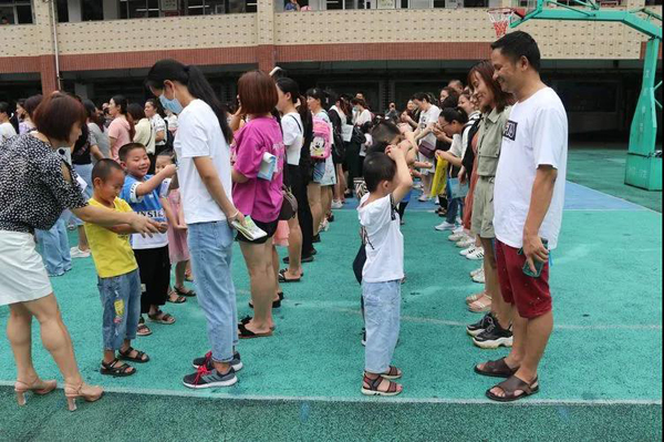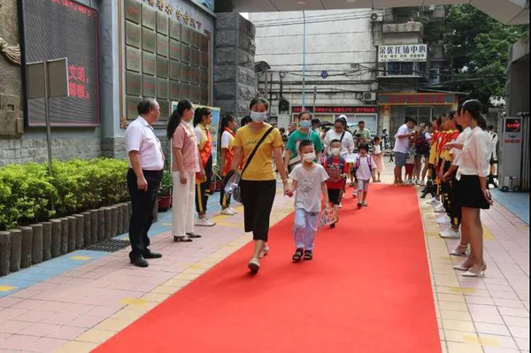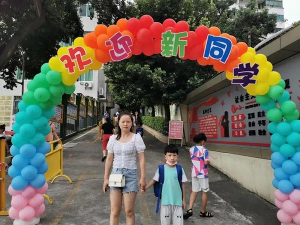三元區(qū)建設小學 孩子們在家長的帶領下來學校報道,走過彩虹,迎接正式成為小學生的第一天。