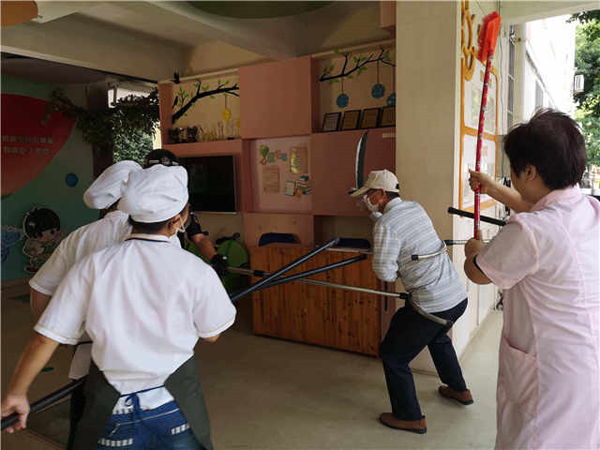 各班教師聽到警報和廣播,迅速將幼兒組織撤離活動場地回到班級,將門窗緊閉,并用桌子等重物堵住教室門,防止“歹徒”破門而入。老師們清點幼兒人數、手持警棍,為保護每個孩子的生命安全時刻做好戰斗準備。 面對危險“歹徒”,安保人員勇往直前,一路猛追,用鋼叉、盾牌、警棍等工具進行防衛攻擊,最終將“歹徒”制服。 活動后,各班組織了“反恐防暴”安全課堂,對幼兒進行心理疏導,并幫助幼兒梳理遇到歹徒時的正確自護自救的應對方式。 |