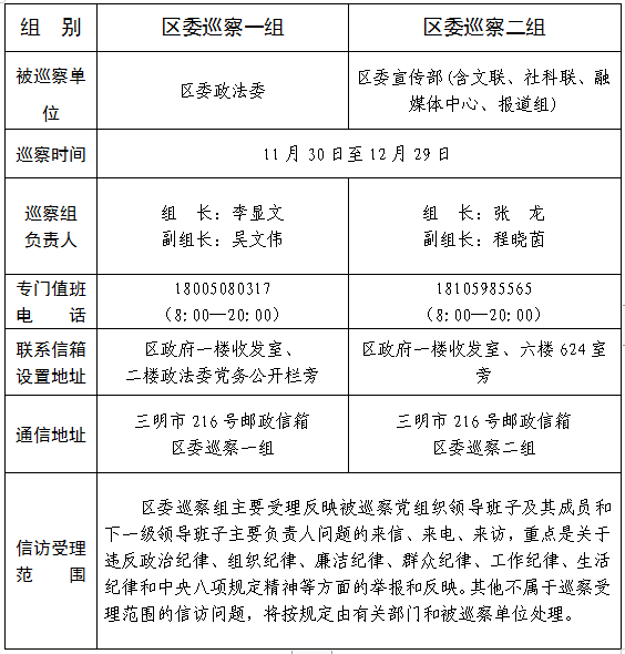 經區委巡察工作領導小組研究并報區委同意,自11月30日起,分別對區委政法委、區委宣傳部(含文聯、社科聯、融媒體中心、報道組)開展常規巡察。日前,2個巡察組已進駐巡察。