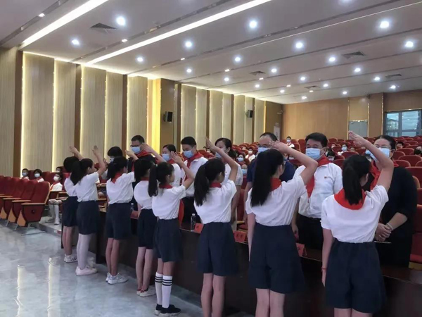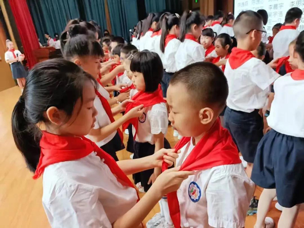 在新隊(duì)員入隊(duì)儀式中,少先隊(duì)員出隊(duì)旗,唱隊(duì)歌,100名新入隊(duì)隊(duì)員佩戴上紅領(lǐng)巾,在少先隊(duì)大隊(duì)輔導(dǎo)員的帶領(lǐng)下鄭重宣誓,立志遵循隊(duì)章、銘記隊(duì)訓(xùn),做優(yōu)秀少先隊(duì)員。