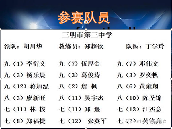 小組賽 以6:0、10:0、9:1的好成績分別戰勝了三明市第六中學,三元區第二實驗學校,三明市第十中學,獲得了小組賽第一名。