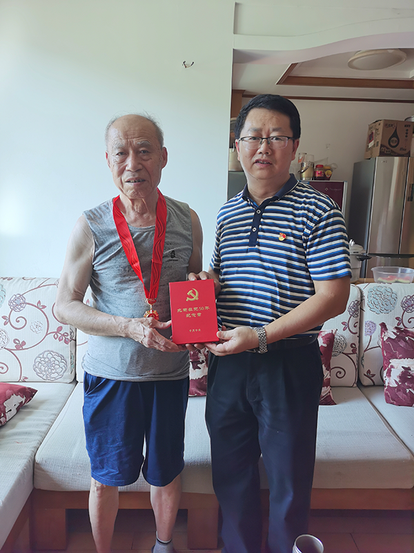 6月27日,區(qū)政協(xié)機(jī)關(guān)黨支部開展“光榮在黨50年”紀(jì)念章頒發(fā)活動(dòng),區(qū)政協(xié)辦公室主任岳青松代表機(jī)關(guān)黨支部向黨齡達(dá)到50年的老黨員武愛民、甘守稻上門頒發(fā)“光榮在黨50年”紀(jì)念章。