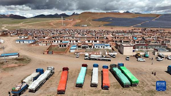 在西藏那曲市雙湖縣多瑪鄉仲魯瑪村,運輸家具的貨車整裝待發(2022年7月13日攝,無人機照片)。新華社記者 晉美多吉 攝 雙湖縣平均海拔5000多米,空氣含氧量只有平原的40%。今年7月,西藏實施雙湖縣第二批高海拔牧民生態搬遷,南部4個鄉鎮的牧民告別苦寒高遠的藏北,前往新家。 “新家政府都裝修好了,東西搬進去就可以住。”多瑪鄉的桑珠憧憬著美好生活,“森布日海拔3600多米,以后上學、看病也會更方便,日子更有盼頭。” 黨的十八大以來,以習近平同志為核心的黨中央以讓老百姓過上好日子作為一切工作的出發點和落腳點,把補齊民生保障短板、解決好人民群眾急難愁盼問題作為社會建設的緊迫任務,不斷加強以保障和改善民生為重點的社會建設,在幼有所育、學有所教、勞有所得、病有所醫、老有所養、住有所居、弱有所扶上持續用力。