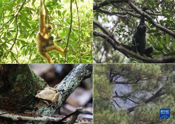 拼版照片:左上圖為2021年5月拍攝的海南長(zhǎng)臂猿B群幼猿(海南熱帶雨林國(guó)家公園管理局供圖);右上圖為在海南熱帶雨林國(guó)家公園體制試點(diǎn)區(qū)霸王嶺自然保護(hù)區(qū)內(nèi)拍攝的海南長(zhǎng)臂猿(2019年10月25日新華社記者蒲曉旭攝);左下圖為在霸王嶺自然保護(hù)區(qū)內(nèi)拍攝的姬蛙(2019年10月26日新華社記者蒲曉旭攝);右下圖為在霸王嶺自然保護(hù)區(qū)內(nèi)拍攝的蛇雕(2019年10月26日新華社記者蒲曉旭攝)。 新華社發(fā) 國(guó)家公園五指山片區(qū),大山深處的毛納村不砍樹、不占田,大力發(fā)展鄉(xiāng)村旅游業(yè)和茶葉特色產(chǎn)業(yè)。村民王瓊香說,她的茶園每年有10多萬元收入,毛納村家家戶戶種茶脫貧致富。
