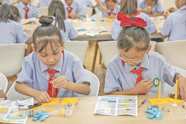9月6日,市科學技術協會在三明市陳景潤實驗小學富興校區開展“喜迎二十大 科普向未來——三明市科普大篷車‘雙匯雙助’進校園”活動,為學校小學生們帶來了一場豐富多彩的科普教育,受到了大家的積極響應和熱烈歡迎。圖為小學生們在制作安裝小型風力發電機。(池永定 攝)
