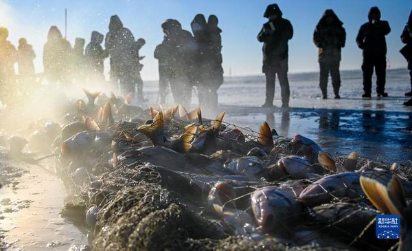 游客在查干湖冰面上近距離觀看冬捕盛況(2021年12月26日攝)。新華社記者 顏麟蘊 攝 向西而行,松原市的查干湖上,“魚把頭”張文正在進行夏季捕魚的收尾工作。“今年,我們已經完成了1300噸的捕撈目標?!睆埼恼f,“為了守護好這片湖水,這兩年我們把細眼小網改成寬眼大網,再按科學計劃投苗,可持續的養殖方式,讓我們實現了習近平總書記‘年年有魚’的美好祝福。”他說。