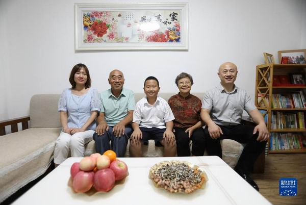 2022年8月17日,沈陽市牡丹社區居民李水(左二)一家合影。新華社記者 王乙杰 攝 中秋假期,在沈陽市皇姑區牡丹社區,居民們紛紛來到黨群服務中心參觀圖片展,暢談社區這十年的巨大變化。 “現在小區的路燈更亮了,綠植更多了,居民的生活也更加便利了?!闭f起變化,77歲居民李水滿面笑容。