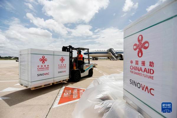 2021年10月14日,工作人員在柬埔寨金邊國際機場運輸中國政府援助柬埔寨的科興新冠疫苗。新華社發(批隆攝) 九年間,已有140多個國家、30多個國際組織同中國簽署200多份共建“一帶一路”合作文件;2013至2021年,中國與沿線國家累計貨物貿易額近11萬億美元,雙向投資超過2300億美元;截至2021年底,中國在24個沿線國家建設79家境外經貿合作區,累計投資430億美元,為當地創造34.6萬個就業崗位……跨越不同地域、不同發展階段、不同文明,共建“一帶一路”不斷走深走實,為各國開辟一條通向共同繁榮的機遇之路。