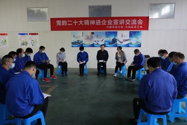 三元區總工會黨組堅持把學習宣傳貫徹黨的二十大精神作為頭等大事,擺上重要工作日程,工會領導干部帶頭學、帶頭講、帶頭干,持續推動黨的二十大精神進企業、進車間、進職工一線,引導廣大職工切實把思想和行動統一到黨的二十大精神上來。 11月25日上午,三明市總工會黨組書記、常務副主席池芝發到三明普諾維機械有限公司宣講黨的二十大精神,與企業勞模代表、一線職工圍坐在一起,面對面交流學習體會。