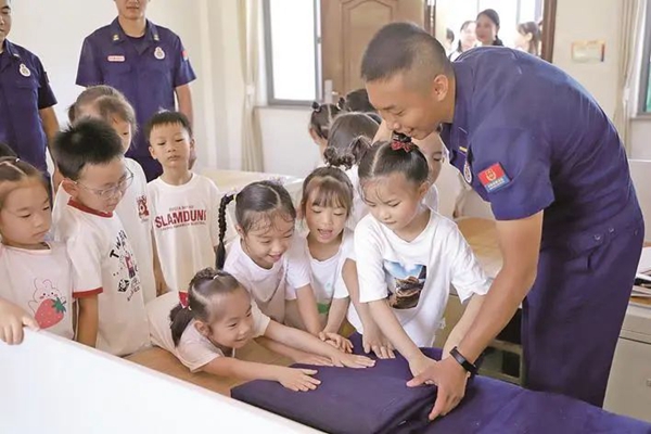 日前,三元區(qū)列東實(shí)驗(yàn)幼兒園幼兒走進(jìn)三明市森林消防大隊(duì)參觀,體驗(yàn)消防員的日常訓(xùn)練生活,進(jìn)一步提高消防安全意識(shí)。圖為消防員帶領(lǐng)幼兒參觀內(nèi)務(wù)。