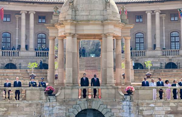 當地時間8月22日上午,正在南非進行國事訪問的國家主席習近平在比勒陀利亞總統府同南非總統拉馬福薩會談。會談前,拉馬福薩在總統府廣場為習近平舉行歡迎儀式。新華社記者 殷博古 攝 8月24日晚,約翰內斯堡。習近平主席同拉馬福薩總統共同主持中非領導人對話會,來自非洲不同地區的各國領導人出席。 “2013年我擔任中國國家主席后,首次出訪就來到非洲,提出真實親誠對非政策理念。”習近平主席動情地回憶。 再次同非洲領導人集體會面,習近平主席宣布,中方愿發起“支持非洲工業化倡議”,實施“中國助力非洲農業現代化計劃”,實施“中非人才培養合作計劃”,助力非洲一體化和現代化事業。 各方相約:明年在中國舉辦下一屆中非合作論壇會議。 習近平主席南非之行,著眼于中非關系再上新臺階,也著眼于金磚合作展現新氣象、“全球南方”團結自強打造新格局。 就在24日上午,約翰內斯堡見證發展中國家聯合自強的歷史性時刻——金磚國家領導人決定:邀請沙特、埃及、阿聯酋、阿根廷、伊朗、埃塞俄比亞正式成為金磚大家庭成員。 “這次擴員是歷史性的,體現了金磚國家同發展中國家團結合作的決心,符合國際社會期待,符合新興市場國家和發展中國家共同利益。”習近平主席向新成員熱情道賀。各國領導人的手緊緊握在一起。 相知無遠近,萬里尚為鄰。百年變局加速演進之際,作為最大發展中國家,中國現代化建設成就,吸引著世界上同樣有著發展振興夢想的國家和民族—— 委內瑞拉總統馬杜羅先后參訪廣東、上海、山東,希望學習借鑒經濟特區建設的成功實踐,習近平主席表示“愿同委方分享有關經驗”; 烏拉圭總統拉卡列來訪,習近平主席同他共同見證一系列雙邊合作文件簽署,拉卡列總統高興地拿起一支印有“人民大會堂”字樣的紅鉛筆留作紀念; 洪都拉斯總統卡斯特羅在中洪建交兩個多月后就對中國進行國事訪問,在習近平主席舉行的歡迎儀式上,卡斯特羅總統興奮地向小朋友們做出“比心”手勢。她由衷感慨,中國的發展成就“讓正直的人有足夠的動力愿意加入其行列,與他們一起奮斗”。 (三)“周邊是搬不走的鄰居,成就鄰居就是幫助自己” “今天是你70歲生日,再次祝你生日快樂。在這個特殊日子里,你來華進行國事訪問,彰顯了兩國關系的高水平,也再次印證了你同中國的不解之緣。” 5月17日下午,陜西賓館。賓主落座,習近平主席微笑著向哈薩克斯坦總統托卡耶夫表達生日祝福。 “謝謝。”曾在華進修和工作多年的托卡耶夫總統高興地用中文回應。 長安復攜手,再顧重千金。初夏,習近平主席同中亞五國元首齊聚西安,出席首屆中國-中亞峰會。 包容四海、兼納百川的仿唐入城儀式;歡迎宴會上的梁家河小米、富平柿子酒、羊肉泡饃;刻有“宅茲中國”的國禮“何尊”……一項項精心安排,講述著源遠流長而又日新月異的中國故事,展現著中國外交講信修睦、親仁善鄰的深厚底蘊。