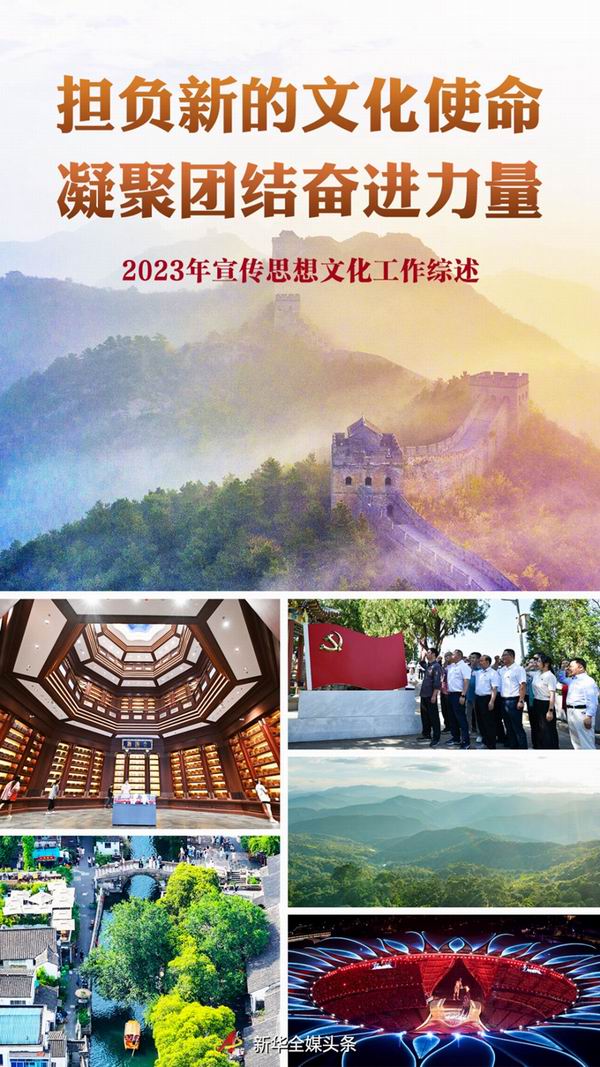 2023年,是全面貫徹黨的二十大精神的開局之年。 面對波譎云詭的國際政治經濟環境和繁重艱巨的改革發展穩定任務,以習近平同志為核心的黨中央團結帶領全黨全國各族人民頂住外部壓力、克服內部困難,錨定黨的二十大擘畫的宏偉藍圖,在強國建設、民族復興新征程上邁出堅實一步。 強國建設、民族復興,需要強大的物質力量,也需要強大的精神力量。 回望過去一年,宣傳思想文化戰線自覺擔負起新的文化使命,圍繞貫徹黨的二十大關于文化建設的戰略部署,強化思想引領、不斷守正創新,大力唱響強信心的主旋律,為黨和國家事業發展提供了堅強思想保證、強大精神力量、有利文化條件。 高擎思想旗幟 深化理論武裝 2023年10月7日至8日,全國宣傳思想文化工作會議在京召開。 圍繞習近平總書記在宣傳思想文化領域提出的一系列新思想新觀點新論斷,與會同志進行了深入討論。在與會同志形成高度共識的基礎上,會議正式提出了習近平文化思想。 時代孕育思想,思想指引航程。 習近平文化思想,是新時代黨領導文化建設實踐經驗的理論總結,豐富和發展了馬克思主義文化理論,構成了習近平新時代中國特色社會主義思想的文化篇,為做好新時代新征程宣傳思想文化工作、擔負起新的文化使命提供了強大思想武器和科學行動指南。 將學習宣傳貫徹習近平文化思想,置于全方位、系統性宣傳闡釋習近平新時代中國特色社會主義思想的大格局中,2023年宣傳思想文化戰線不斷推動黨的創新理論深入人心、落地生根。 深化主題教育,掀起學習熱潮—— 2023年11月18日,一場精彩的“主題教育進行時”專題學習活動在江蘇省海安市濱海新區舉行。 活動中,濱海新區駐滬流動黨員們進行理論學習、開展分享交流,一輪接一輪助力家鄉發展的探討更將現場氣氛推向高潮。 從大江南北到長城內外,從東海之濱到青藏高原,學習貫徹習近平新時代中國特色社會主義思想主題教育在全黨深入開展。