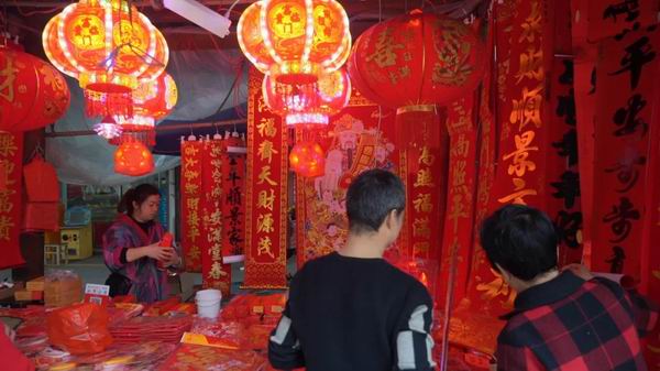 攤位上,紅彤彤的燈籠、春聯、五福掛件、年畫、福字等春節飾品應有盡有,營造出紅紅火火的喜慶氛圍。