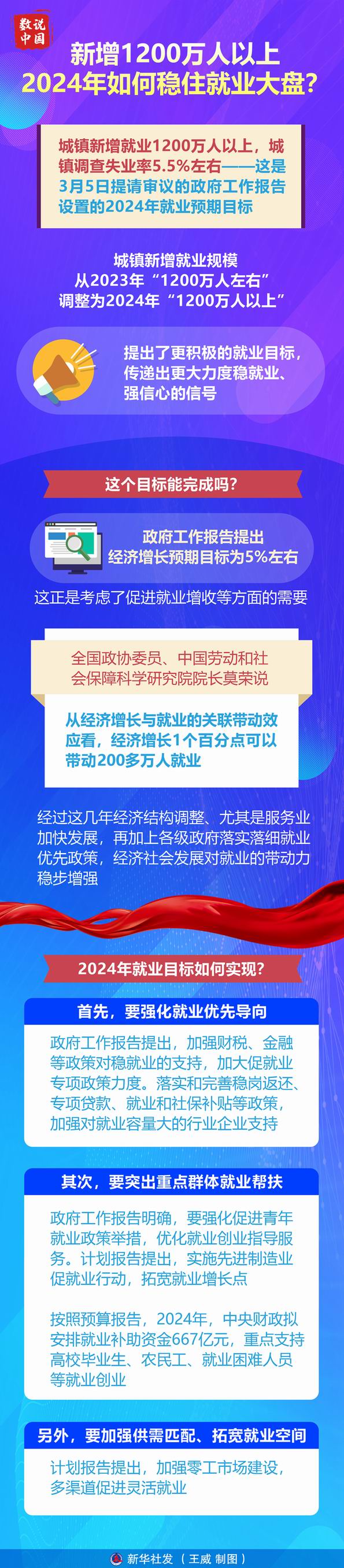 新華社北京3月5日電 題:新增1200萬人以上,2024年如何穩住就業大盤? 新華社記者姜琳 城鎮新增就業1200萬人以上,城鎮調查失業率5.5%左右——這是5日提請審議的政府工作報告設置的2024年就業預期目標。 城鎮新增就業規模從去年“1200萬人左右”調整為今年“1200萬人以上”,提出了更積極的就業目標,傳遞出更大力度穩就業、強信心的信號。 就業是最大的民生,也是經濟發展最基本的支撐。為什么今年的目標這樣設定? “這體現了對民生的高度關切,也是基于現實考量。”全國政協委員、中國勞動和社會保障科學研究院院長莫榮表示,在2024年經濟運行風險挑戰增多、重點人群就業壓力較大的情況下,必須把解決群眾就業問題放在更加突出的位置,體現出就業優先的政策導向。 今年需要在城鎮就業的新成長勞動力繼續保持高位,高校畢業生規模預計再創新高、超過1170萬人,同時還有大量農民工需要解決就業問題。因此,穩住就業大盤十分關鍵。 這個目標能完成嗎? 政府工作報告提出,經濟增長預期目標為5%左右。這正是考慮了促進就業增收等方面的需要。 “從經濟增長與就業的關聯帶動效應看,經濟增長1個百分點可以帶動200多萬人就業。”莫榮委員說,經過這幾年經濟結構調整、尤其是服務業加快發展,再加上各級政府落實落細就業優先政策,經濟社會發展對就業的帶動力穩步增強。 回看就業目標完成情況,過去3年,我國每年完成城鎮新增就業均超過1200萬人。2023年,GDP增長5.2%,全國城鎮新增就業1244萬人,農村勞動力外出務工規模繼續增加,脫貧人口務工規模達到3397萬人。 2024年就業目標如何實現? ——首先,要強化就業優先導向。 政府工作報告提出,加強財稅、金融等政策對穩就業的支持,加大促就業專項政策力度。落實和完善穩崗返還、專項貸款、就業和社保補貼等政策,加強對就業容量大的行業企業支持。 ——其次,要突出重點群體就業幫扶。 政府工作報告明確,要強化促進青年就業政策舉措,優化就業創業指導服務。計劃報告提出,實施先進制造業促就業行動,拓寬就業增長點。實施好促進青年就業三年行動。優化機關事業單位、國企等政策性崗位招聘(錄)安排。 按照預算報告,2024年,中央財政擬安排就業補助資金667億元,重點支持高校畢業生、農民工、就業困難人員等就業創業。 ——另外,要加強供需匹配、拓寬就業空間。 計劃報告提出,加強零工市場建設,多渠道促進靈活就業。加快調整高校學科專業布局結構,促進高校學科專業設置與人才實際需求更加匹配,開展百萬青年職業技能培訓。