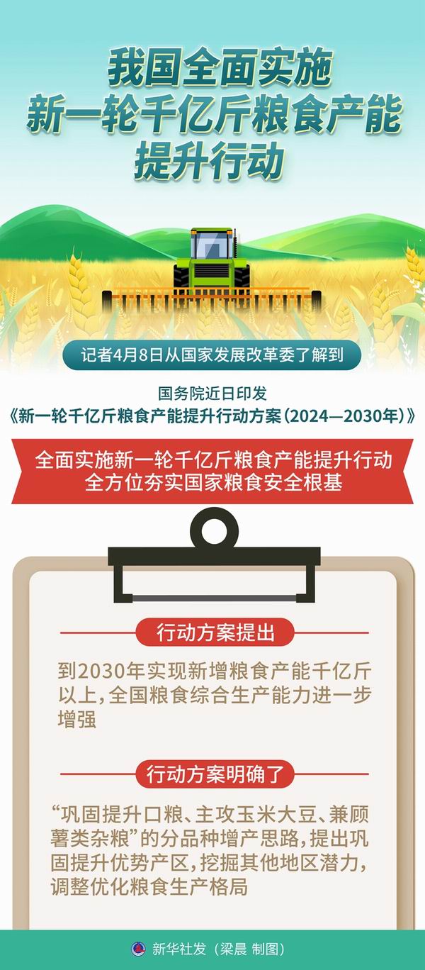 新華社北京4月8日電(陳煒偉、李昌瑞)記者8日從國家發(fā)展改革委了解到,國務(wù)院近日印發(fā)《新一輪千億斤糧食產(chǎn)能提升行動方案(2024—2030年)》,全面實施新一輪千億斤糧食產(chǎn)能提升行動,全方位夯實國家糧食安全根基。