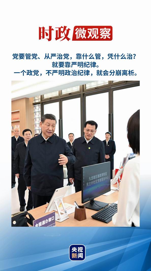 △2024年4月22日,習(xí)近平總書記來到重慶九龍坡區(qū)謝家灣街道民主村社區(qū),察看小區(qū)改造和便民服務(wù)情況,聽取提升基層治理效能、為基層減負(fù)情況介紹。 3月在湖南考察時(shí),總書記強(qiáng)調(diào):“組織開展好黨紀(jì)學(xué)習(xí)教育,引導(dǎo)黨員干部學(xué)紀(jì)、知紀(jì)、明紀(jì)、守紀(jì),督促領(lǐng)導(dǎo)干部樹立正確權(quán)力觀,公正用權(quán)、依法用權(quán)、為民用權(quán)、廉潔用權(quán)。” 《關(guān)于在全黨開展黨紀(jì)學(xué)習(xí)教育的通知》明確要求,把遵規(guī)守紀(jì)刻印在心,內(nèi)化為言行準(zhǔn)則,進(jìn)一步強(qiáng)化紀(jì)律意識(shí)、加強(qiáng)自我約束、提高免疫能力,增強(qiáng)政治定力、紀(jì)律定力、道德定力、抵腐定力。 ——扎緊黨規(guī)黨紀(jì)的籠子 黨性、黨風(fēng)、黨紀(jì)是有機(jī)整體,黨性是根本,黨風(fēng)是表現(xiàn),黨紀(jì)是保障。習(xí)近平總書記要求把紀(jì)律建設(shè)擺在更加突出位置,“扎緊黨規(guī)黨紀(jì)的籠子”。 去年12月8日,習(xí)近平總書記主持召開中央政治局會(huì)議。會(huì)議的重要議程之一就是審議《中國(guó)共產(chǎn)黨紀(jì)律處分條例》。 《中國(guó)共產(chǎn)黨紀(jì)律處分條例》是管黨治黨的重要基礎(chǔ)性法規(guī)。黨的十八大以來,我們黨先后3次修訂《條例》,始終堅(jiān)持嚴(yán)的基調(diào),全面加強(qiáng)黨的紀(jì)律建設(shè),在全鏈條全周期全覆蓋上持續(xù)用力,不斷增強(qiáng)自我凈化、自我完善、自我革新、自我提高能力。