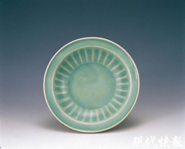 龍泉窯梅子青菊瓣紋洗 蘇州博物館藏 梅子青是龍泉窯于南宋時期創(chuàng)燒的品種。采用多次施釉法,釉層比粉青更厚,入窯后經(jīng)高溫強還原焰燒成。