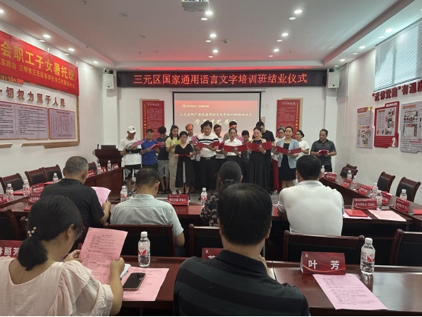 7月31日,為期三個(gè)月的三元區(qū)“籽籽同心 語(yǔ)通促融”推廣國(guó)家通用語(yǔ)言文字培訓(xùn)班結(jié)業(yè)儀式在六路社區(qū)舉行,三明市民族宗教局副局長(zhǎng)賴德農(nóng),區(qū)委常委、統(tǒng)戰(zhàn)部部長(zhǎng)伍英以及新疆駐閩工作組、區(qū)民宗局、區(qū)教育局、區(qū)反恐辦、徐碧街道、六路社區(qū)等單位有關(guān)負(fù)責(zé)同志及授課教師代表、參訓(xùn)學(xué)員共計(jì)40余人參加結(jié)業(yè)儀式。