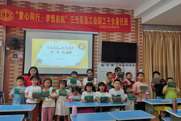 共繪紅色記憶 東乾社區職工子女暑托班熱鬧非凡,孩子們親手制作紅軍包,一針一線間仿佛穿越時空,追憶著革命先輩的艱苦歲月。他們還用紅色卡紙精心折出徽章,準備獻給敬愛的老兵們。此外,孩子們在 10 米長卷上盡情涂鴉集體作畫,用畫筆抒發對軍人的崇敬之情。