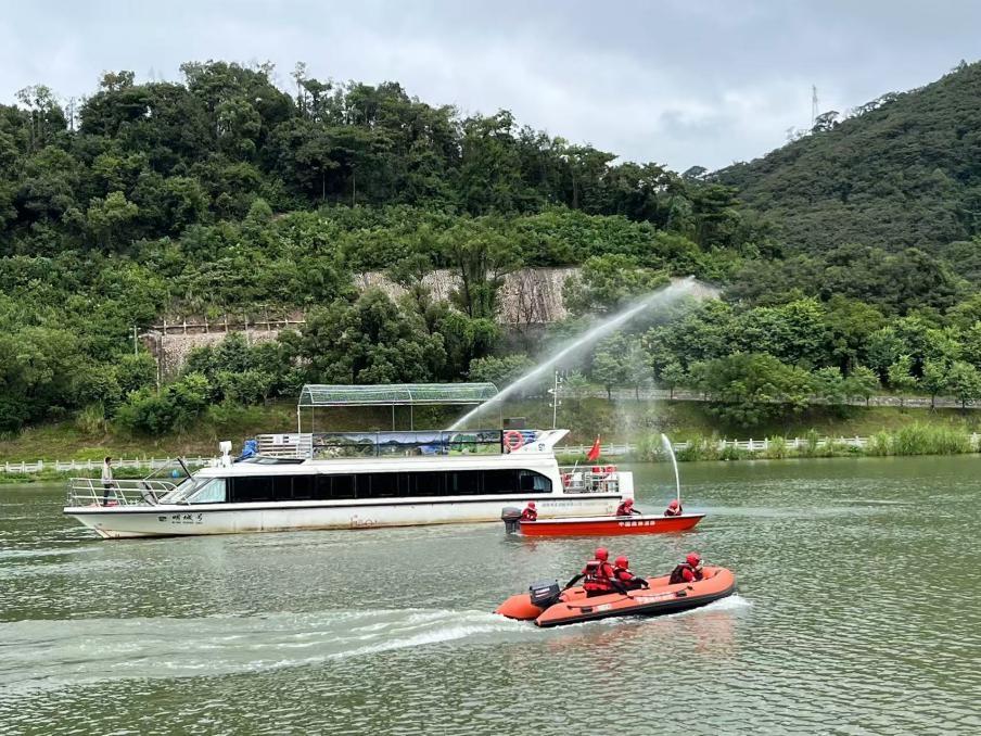演練重點圍繞船舶消防、乘客轉移、落水人員搜救、船舶拖帶防漂流等科目展開。構建了明城文旅號在航行過程中船尾機艙處所突然冒煙起火,船舶組織自救無法航行,船上游客急需緊急轉移的情景。海事部門收到報警后,第一時間啟動內河水上交通突發事件應急救援預案開展救援。同時,智能飛行救生圈、智能遙控水上救援機器人、無人機等智能救生設備也在演練中陸續登場“亮相”,各參演單位圓滿完成了從險情接報、指揮部署到遇險人員急救轉移的重要應急處置流程,既檢驗了在水上救援等突發事件中的快速反應能力,又強化了多部門的組織指揮和應急反應協作機制。本次演練出動了包括救援艇、客船等在內的各類船舶共6艘、交通執法車輛2輛、涉及參演人員70余人。