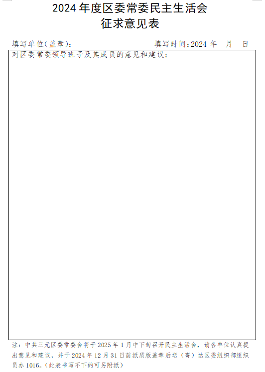 中共三元區委常委會將于2025年1月中下旬召開民主生活會,請廣大網民群眾提出意見和建議,并于2024年12月31日前紙質版蓋章后送(寄)達區委組織部組織員辦1016。