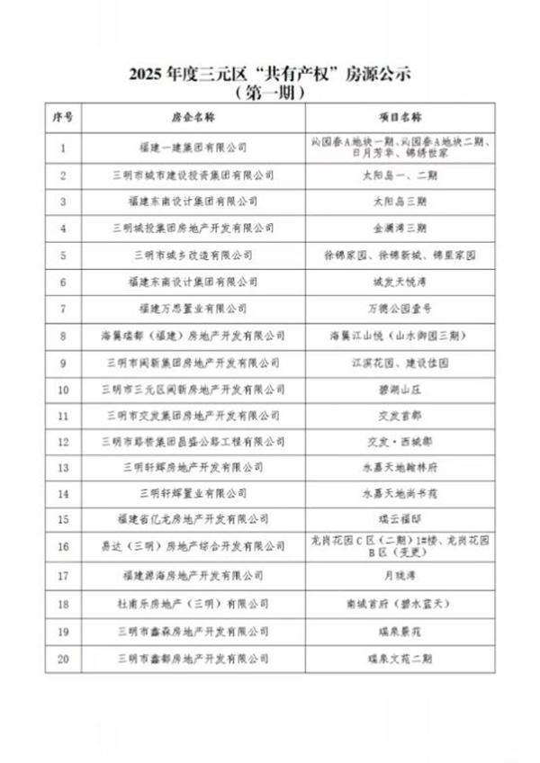 為推進存量商品房處置,構建房地產發展新模式,滿足中低收入群體居住與產權的雙重需求,完善住房保障體系,促進房地產市場穩健發展,三元區人民政府聯合市住建局、市自然資源局、市財政局,依據三明市人民政府專題會議精神,共同制定了《三元區支持購買“共有產權”住房的實施細則》。政策一經推出,市區房企積極響應,首期便有20家房企公司的28個項目加入“共有產權”房源庫。