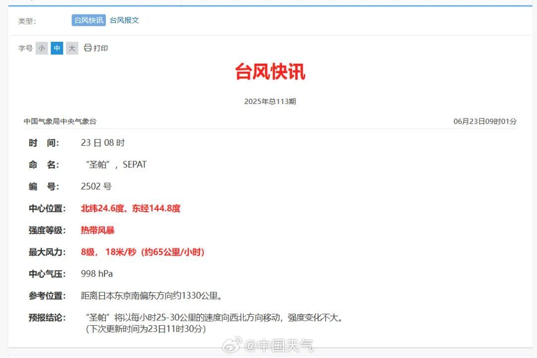據@中國天氣,今天,今年第2號臺風“圣帕”生成,“圣帕”(熱帶風暴級;英文名稱:Sepat;名字來源:馬來西亞;名稱意義:淡水鱸魚類)于今天(6月23日)上午8點鐘在西北太平洋洋面生成,其中心位于日本東京南偏東方約1330公里的洋面上,就是北緯24.6度、東經144.8度,中心附近最大風力有8級(18米/秒),中心最低氣壓為998百帕,七級風圈半徑80-260公里。 預計,“圣帕”將以每小時25-30公里的速度向西北轉偏北方向快速移動,逐漸向日本本州島南部沿海靠近,強度變化不大。