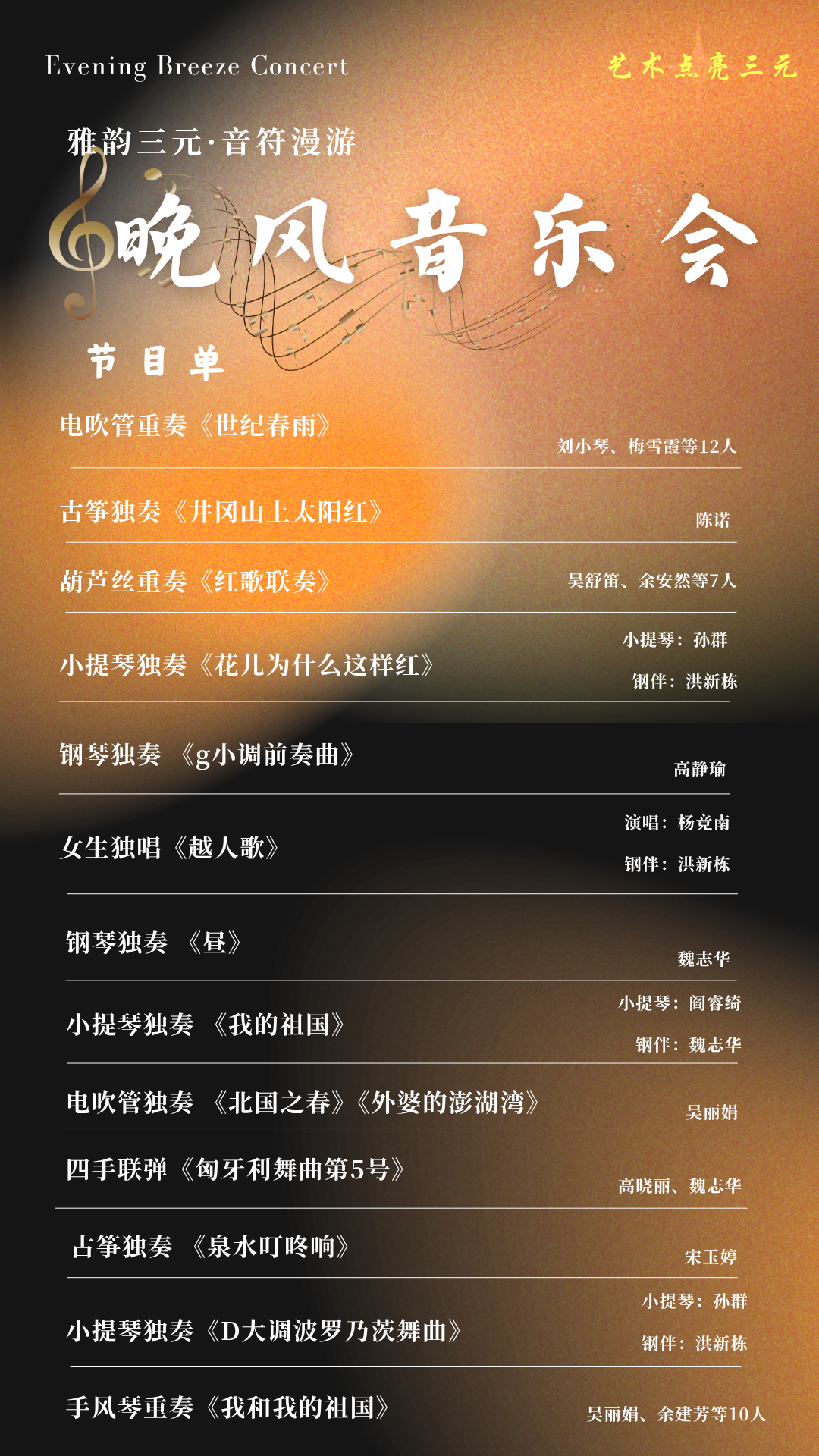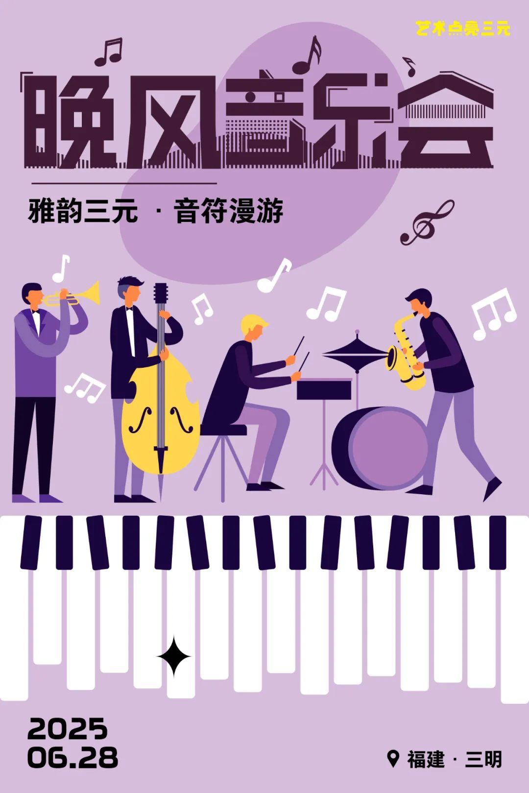 晚風音樂會 活動信息 活動主題 “晚風音樂會” 活動時間 2025年6月28日 19:30—21:00 活動地點 三明愛琴海中心廣場 節目單