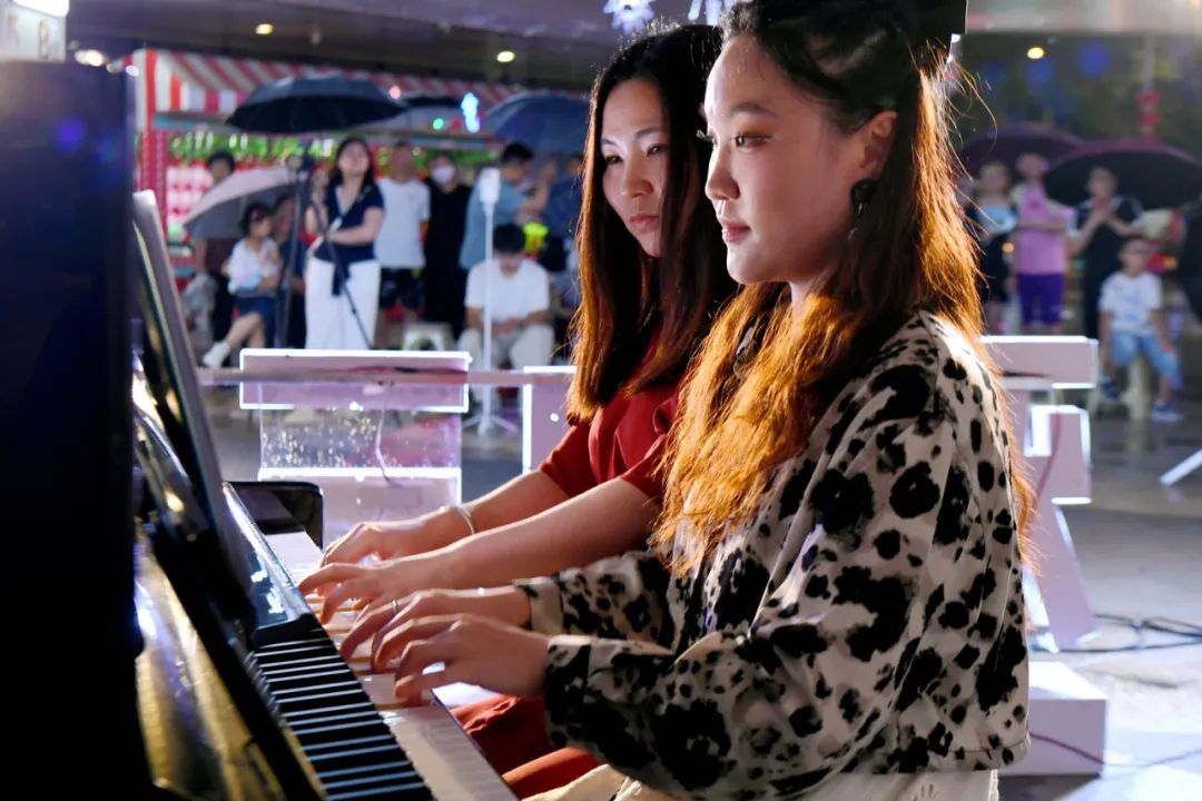廣場中央,電吹管重奏《世紀(jì)春雨》率先以金屬質(zhì)感的音色劃破夜空。葫蘆絲《紅歌聯(lián)奏》的悠揚(yáng)旋律與古箏《井岡山上太陽紅》的清脆琴音交相輝映,禮贊黨和祖國。《花兒為什么這樣紅》在小提琴中傾訴婉轉(zhuǎn)情思,鋼琴獨(dú)奏《g小調(diào)前奏曲》在黑白鍵上流淌出古典詩意,更有四手聯(lián)彈《匈牙利舞曲第5號(hào)》的激情碰撞......一首首優(yōu)美的旋律巧借夜色為幕,將三元的夏夜譜寫成流動(dòng)的城市交響詩。這場無需門票、沒有圍墻的音樂派對(duì),用激昂旋律吹響奮進(jìn)號(hào)角,為黨的生日送上了深情祝福,讓高雅藝術(shù)真正“活”在廣大群眾的日常生活,成為一段段值得回味的精神旅程。