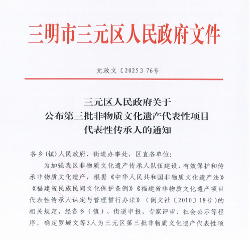 近日,經區非遺保護中心對轄區內非遺技藝精湛、傳承成效顯著的從業者進行全面摸排,共3名代表性傳承人成功入選三元區第三批非物質文化遺產代表性項目代表性傳承人名單。截止目前,三元區共有非物質文化遺產代表性傳承人9名,其中省級3名,市級2名,區級4名,為非遺技藝的高水平傳承筑牢了根基。