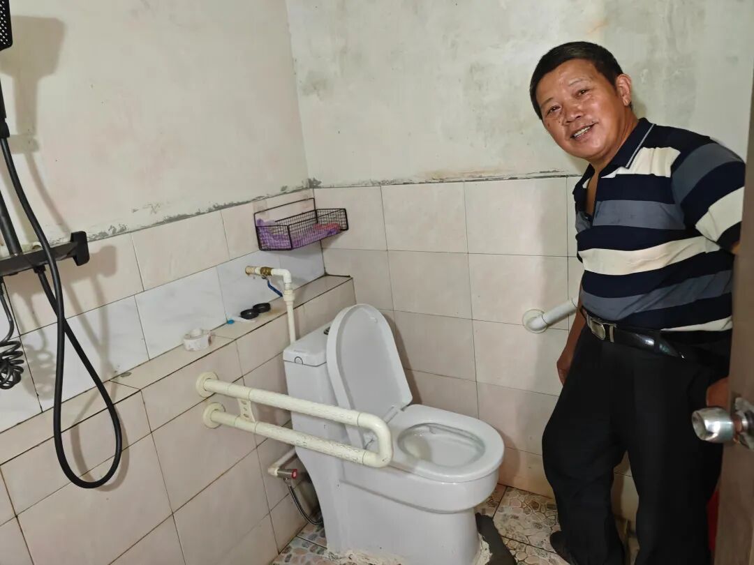 巖前鎮姜文靜公婆家改造后一角(巖前鎮黨政辦供圖) 黃光裕年過六旬,多年前因高血壓引發中風,行動不如從前。現在,父母和他一起住,照顧其飲食起居,然而,即便住在一起,也無法做到全天候守護。 廁所是老人活動的“高危區”,還好在鎮里的適老化改造的幫助下,家中安裝上馬桶扶手和坐式洗澡椅,黃光裕實現了自主如廁和洗浴;門前有了水泥護坡和扶手,父母那顆懸著的心也放了下來。