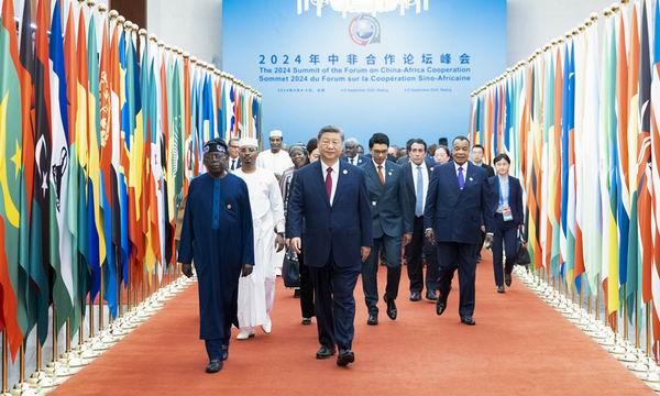 9月5日上午,國家主席習近平在北京人民大會堂出席中非合作論壇北京峰會開幕式并發(fā)表主旨講話。這是習近平同外方領(lǐng)導人共同步入會場。新華社記者 殷博古 攝